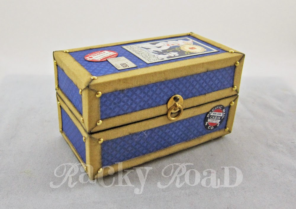 First, the trunk. I made this from the same 4" by 2" by 2" chipboard steamer trunk kit I used to make the Tiny Traveler. This one's a little brighter in color, because hey, it's a circus.