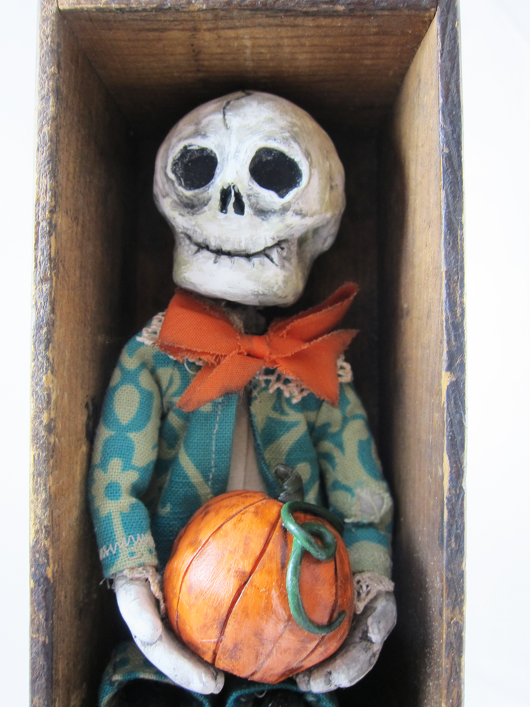 I removed the top of each coffin box to save for another project. With an x-acto knife, I cut out a window from the box bottom before painting each car. The number 8 car features painted flames and a scary black widow spider on the front. The orange car, number 31, has skeleton arms and some red headlights shining through the eyes of the skull on the front. (There's a view of the underside of this car showing how those lights were installed at the bottom of this post.)